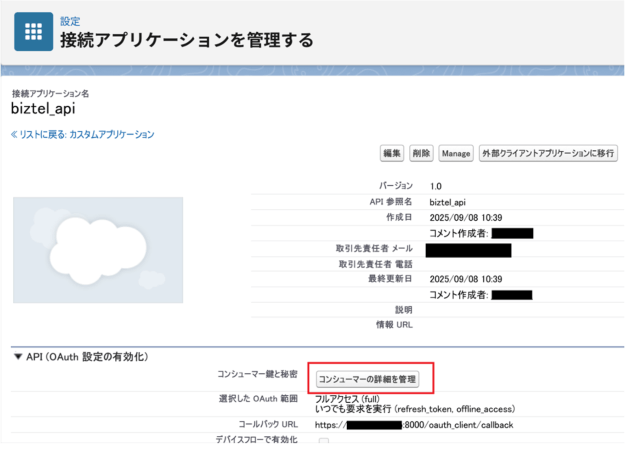 「API(OAuth設定の有効化)」に表示されている「コンシューマーの詳細を管理」をクリック