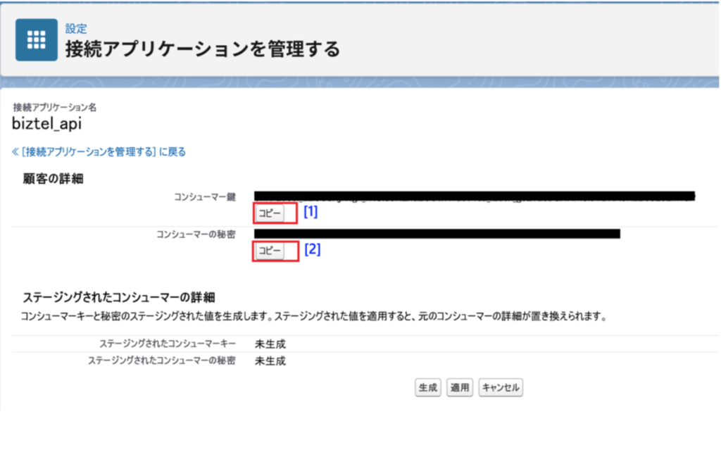 ④接続アプリケーションを管理する」画面で先ほど登録したアプリケーションの「コンシューマ鍵」と「コンシューマの秘密」をコピーします(下図参照)。
