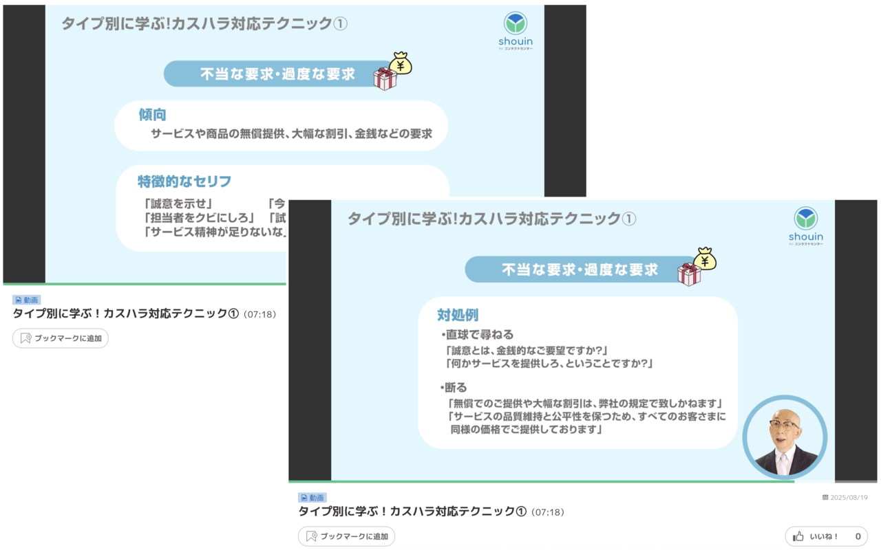また、今回のカスハラ対応のテクニックに加え、カスハラについて組織的に対策するための体制構築やルール整備、スタッフへのフォローといったSV・マネージャー向けの研修動画の拡充も予定しています。
