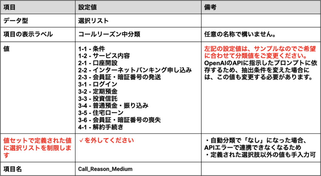- 上述の『Salesforce事前準備 2.活動オブジェクトにカスタム項目を新規作成』で作成した、「コールリーズン大分類」「コールリーズン中分類」「コールリーズン小分類」の設定値もあわせて変更してください。