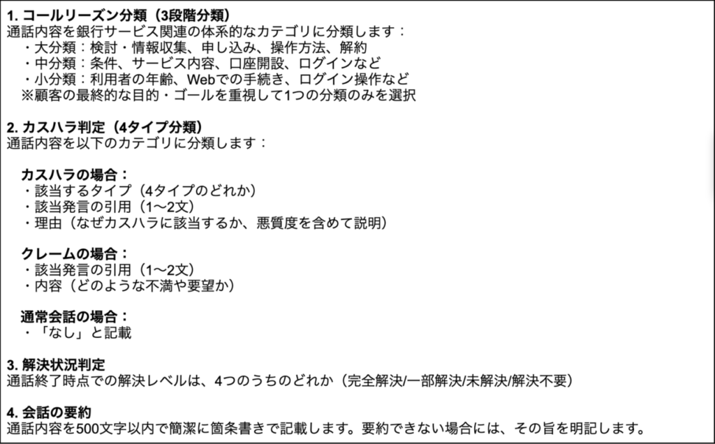 なお今回の挑戦では、コールリーズン分類に加え、vol.16のブログでご紹介した「カスハラの自動判定」や、問い合わせの解決状況の評価、通話内容の要約まで、まるっと自動化させる内容となっています。