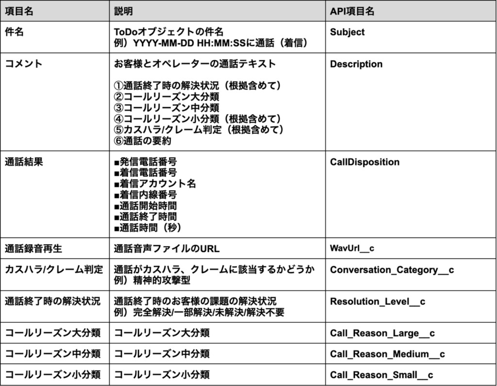 Salesforceに通話内容を連携した結果、このようになりました。