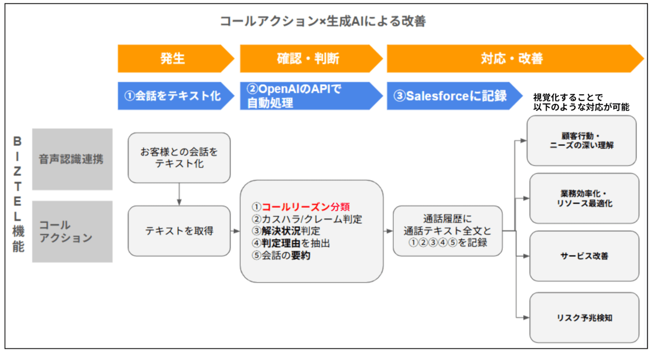 今回は、「生成AI」とBIZTELの「API連携コールアクション」「音声認識連携」機能を活用して、通話内容からコールリーズンを自動分類するとともに、問い合わせの解決状況やカスハラ発生の有無について判定を行い、Salesforceへ連携する仕組みを実践しました。