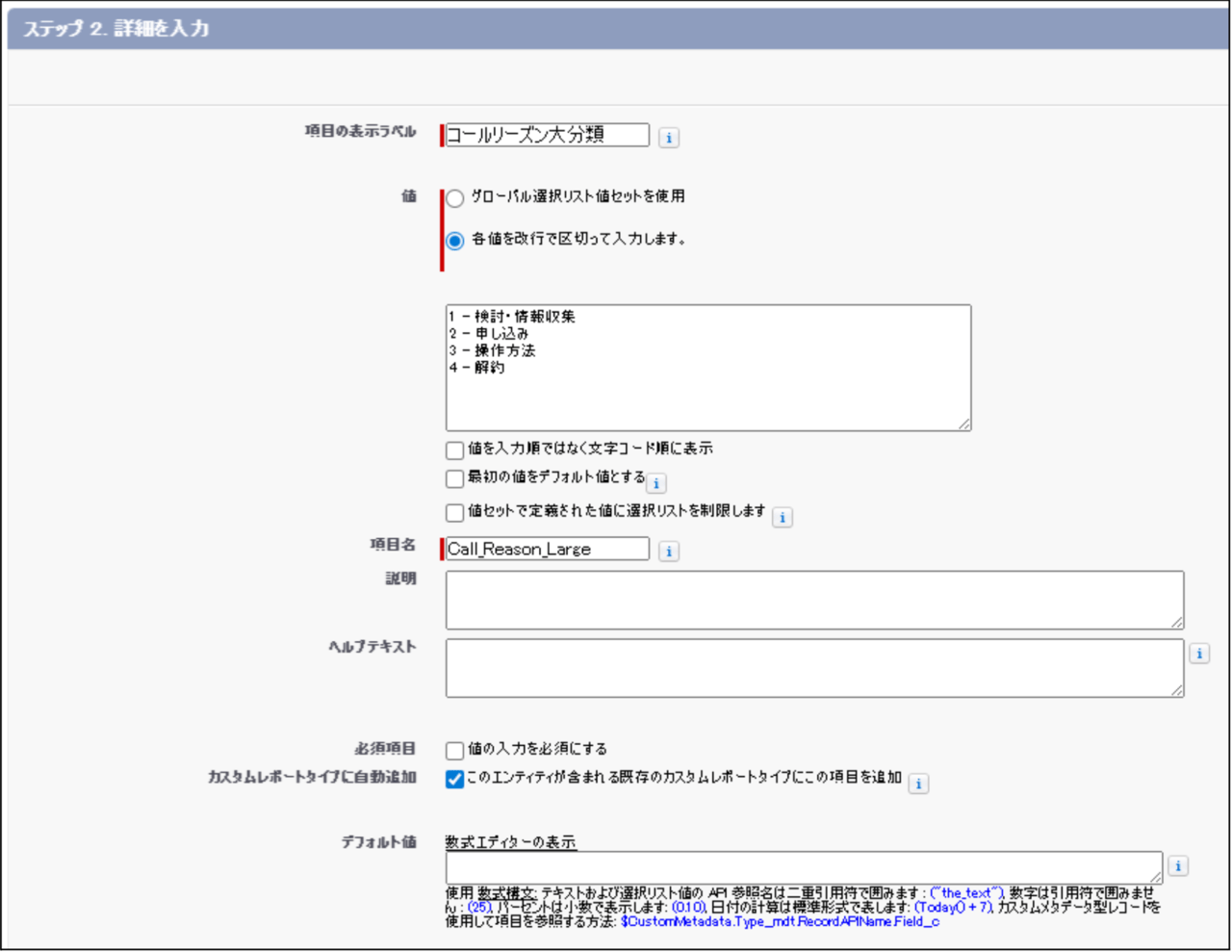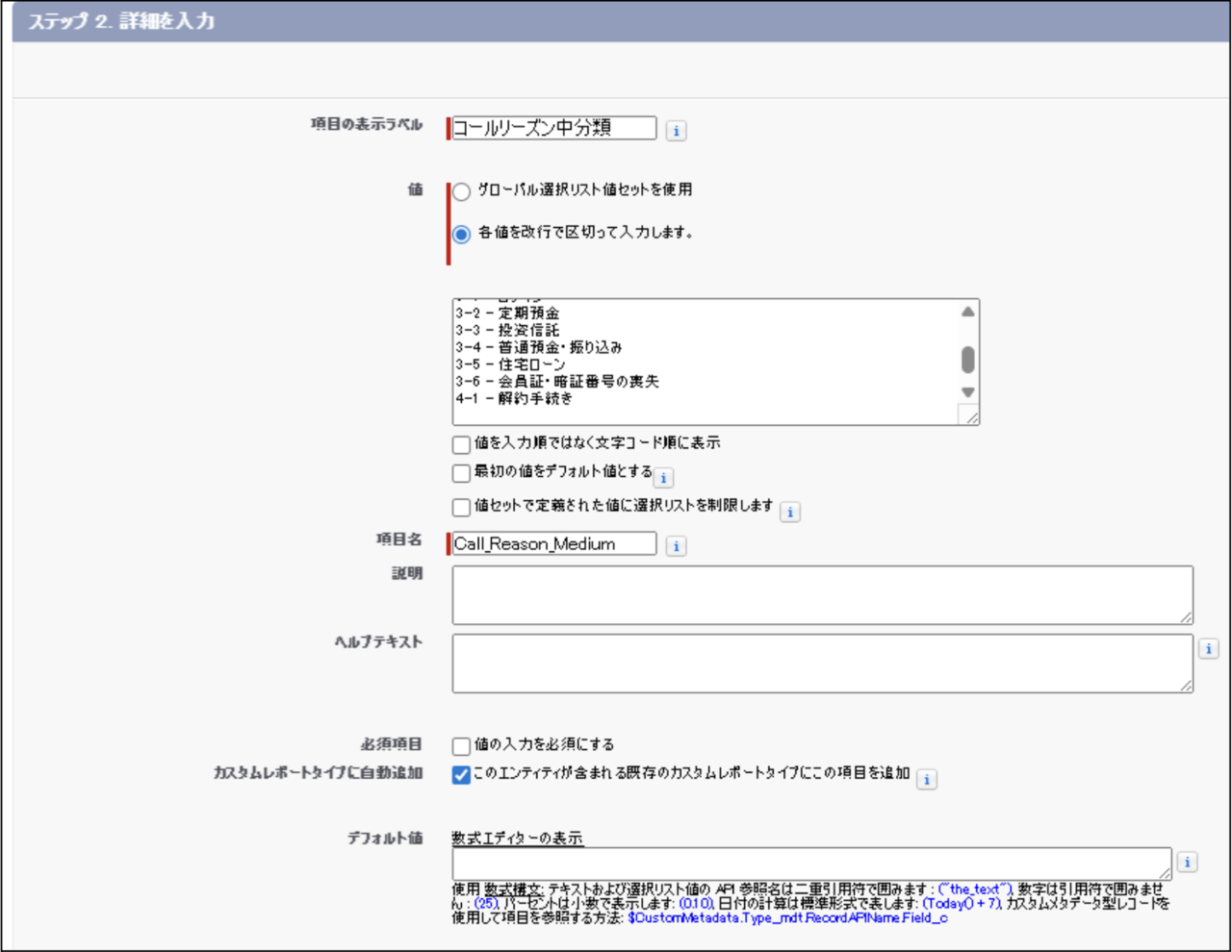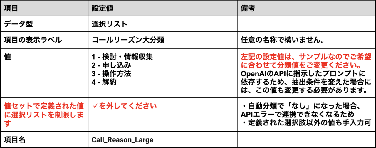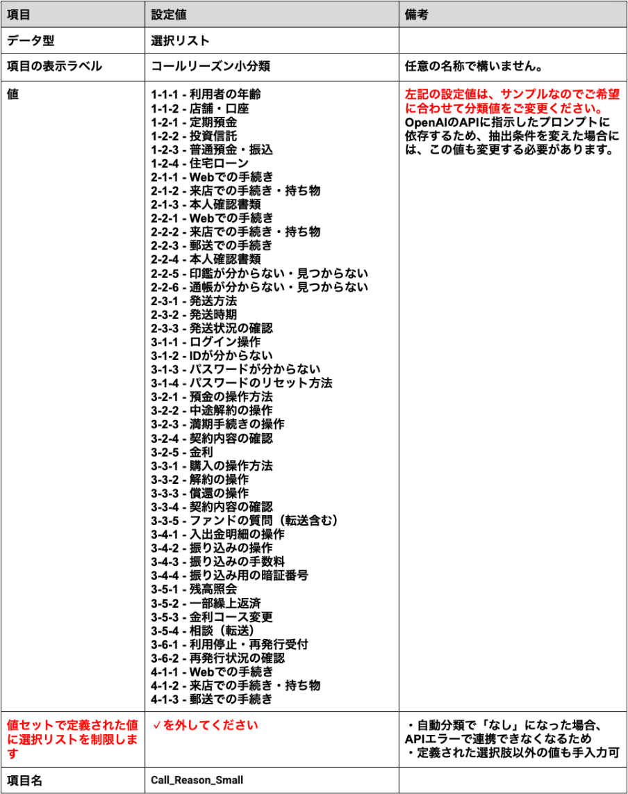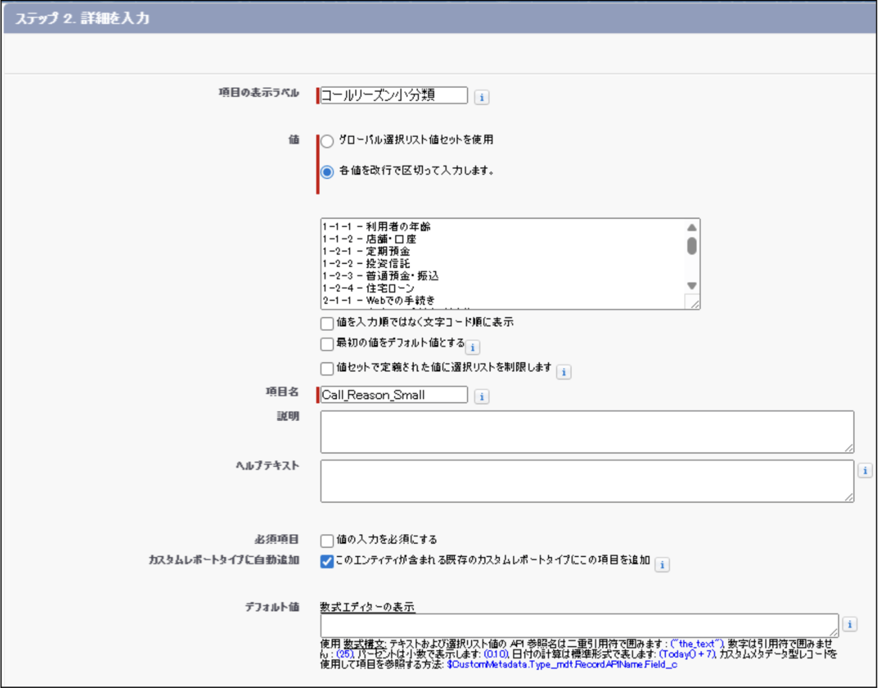 - 上述の『Salesforce事前準備 2.活動オブジェクトにカスタム項目を新規作成』で作成した、「コールリーズン大分類」「コールリーズン中分類」「コールリーズン小分類」の設定値もあわせて変更してください。