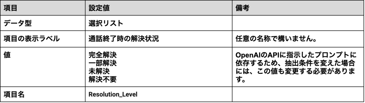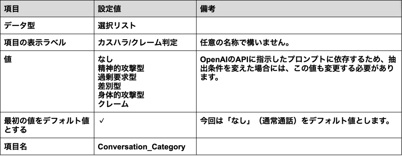 抽出した情報を格納する項目が必要なので、以下に従って作成してください。作成方法については、こちらの「2.3 カスタム項目の作成」を参考に作成してください。