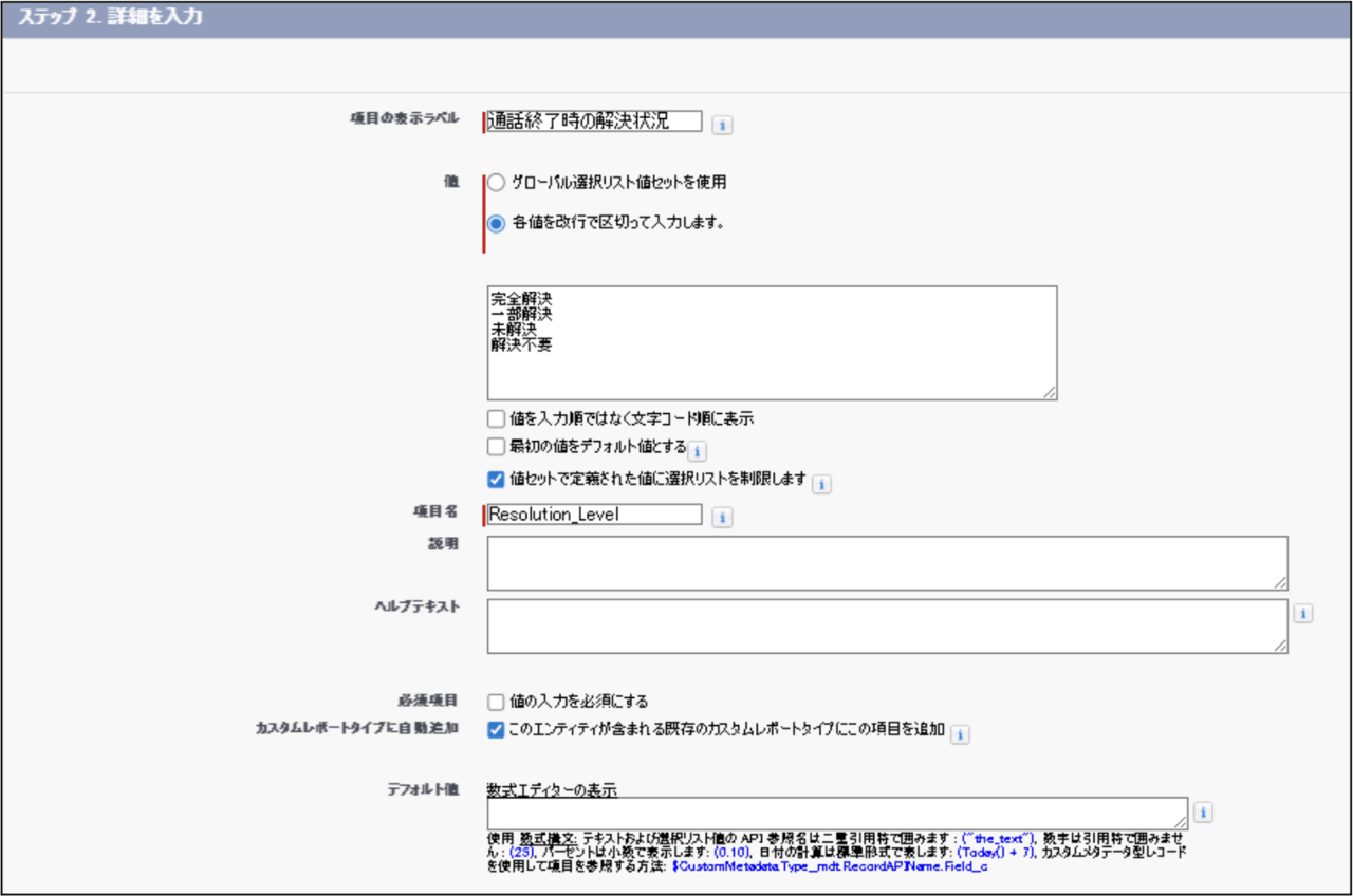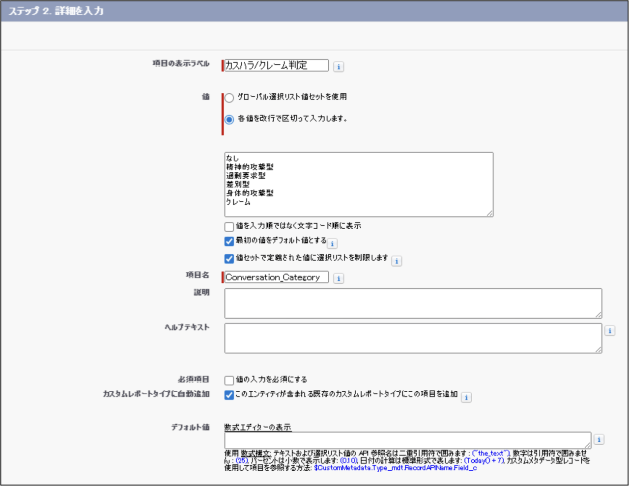 - 上述の『Salesforce事前準備 2.活動オブジェクトにカスタム項目を新規作成』で作成した、「カスハラ/クレーム判定」の設定値もあわせて変更してください。