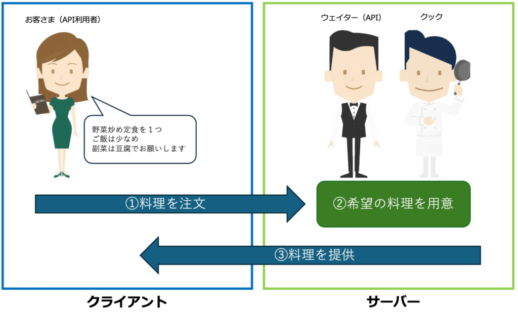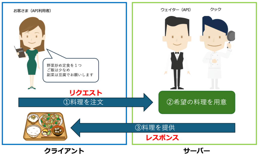 - クライアント:APIを利用してデータやサービスをリクエストする側。これは、レストランで料理を注文するお客さまのイメージです。
