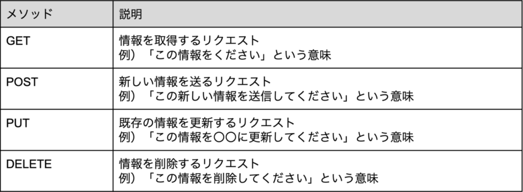 メソッドは、APIを通じてサーバーに「何をしたいか」を伝えるための指示です。各メソッドには、特定の役割があります。
