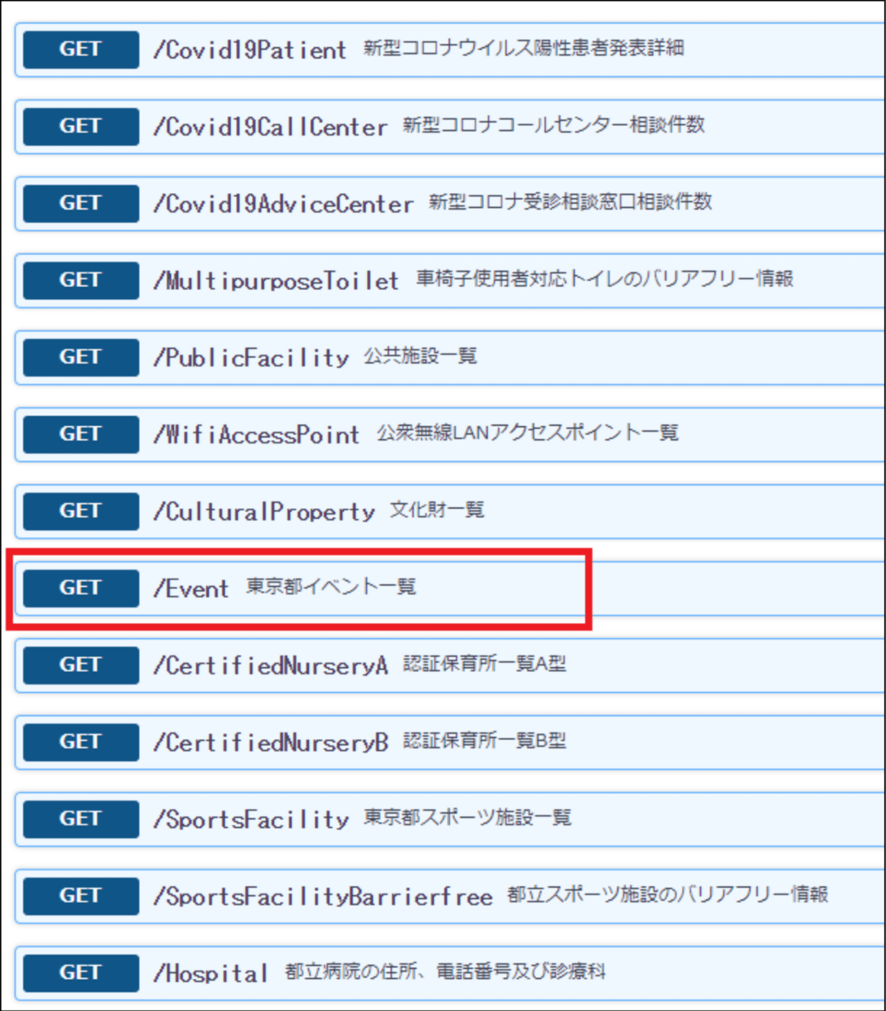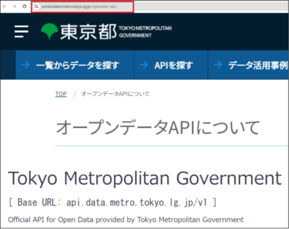 今回利用するのは、東京都が公開しているオープンデータAPIです。以下のWebページが表示されればOKです。