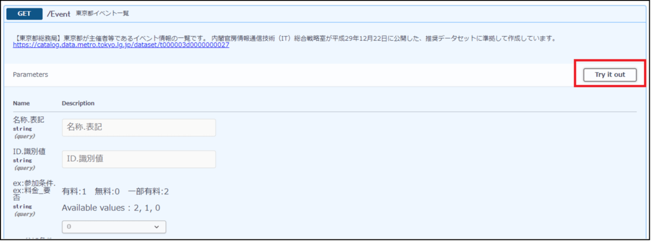 「東京都イベント一覧情報」の詳細ページが開きます。右上の「Try it out」ボタンをクリックします。