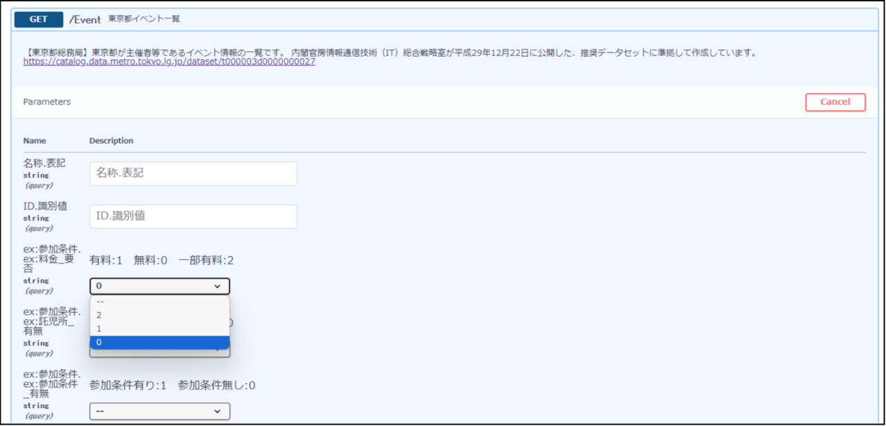 「Parameters」の入力欄が編集可能になります。「Parameters」とは、APIに送る追加情報のことです。ここでは、これを検索条件として利用し、東京都のイベント一覧情報を絞り込むための条件を指定します。