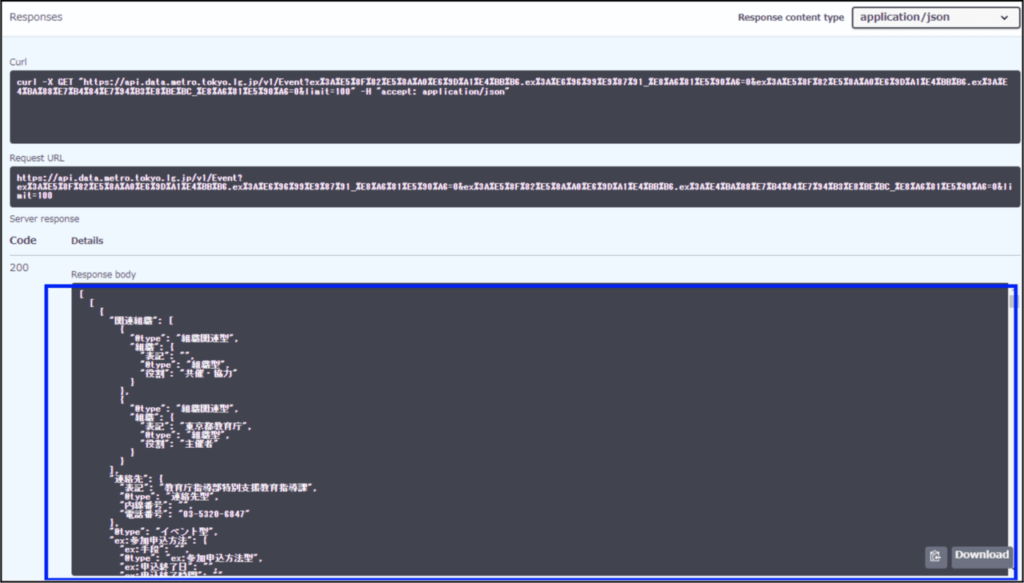 サーバーからのレスポンスは JSON形式(※2)で表示されています。「Server response > Response body」を確認すると、今回設定した条件に合致したイベント情報が、JSON形式で表示されています。