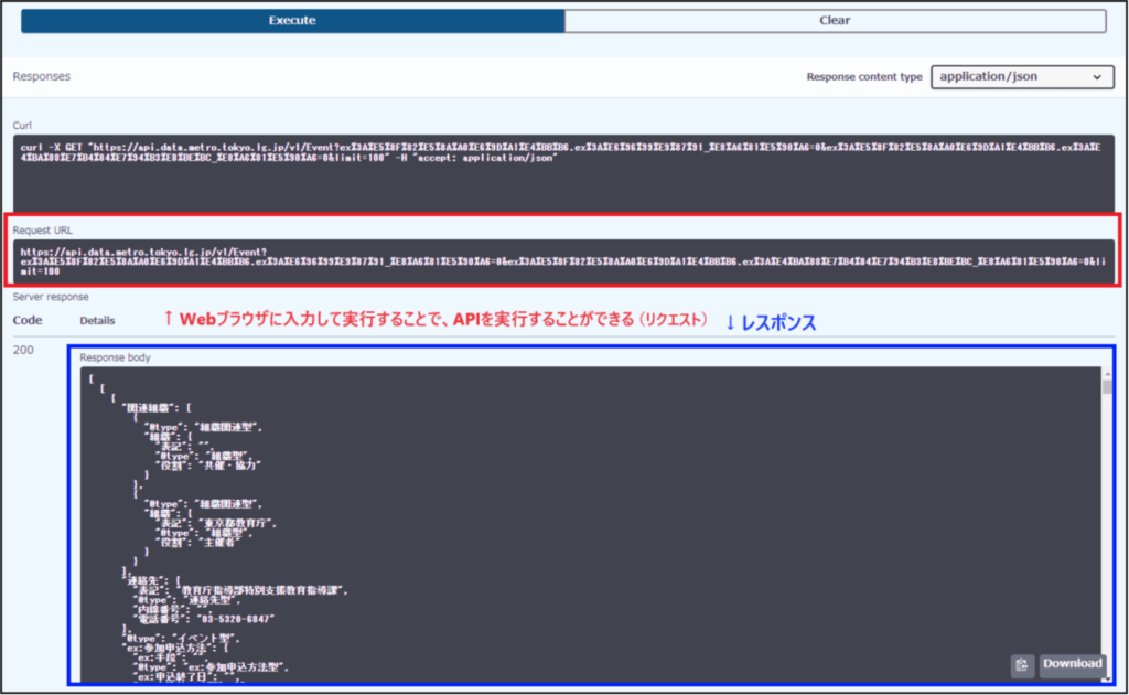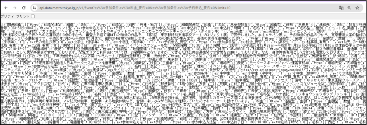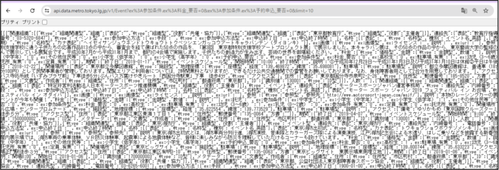 オープンデータのAPI画面での実行結果と同じ内容を、Webブラウザでも確認することができます。