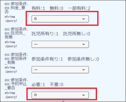 今回は、無料かつ予約不要のイベントを検索するために、「料金_要否」に0を、「予約申込_要否」に0を設定して検索してみましょう。