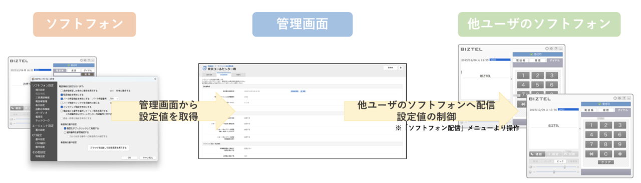 「ソフトフォン配信設定」は、BIZTELの管理画面であらかじめ決めたソフトフォンの各種設定値を、任意のソフトフォンに一括配信し、さらに個人による設定値操作の一部を制御できる機能です。