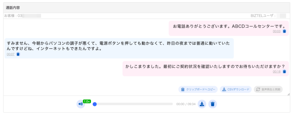 オペレーターが電話を終えた後に、自分自身で内容を振り返るために使っています。テキストをクリックするとその部分の通話録音が再生される機能を使って応対内容を確認し、不安を払拭しています。