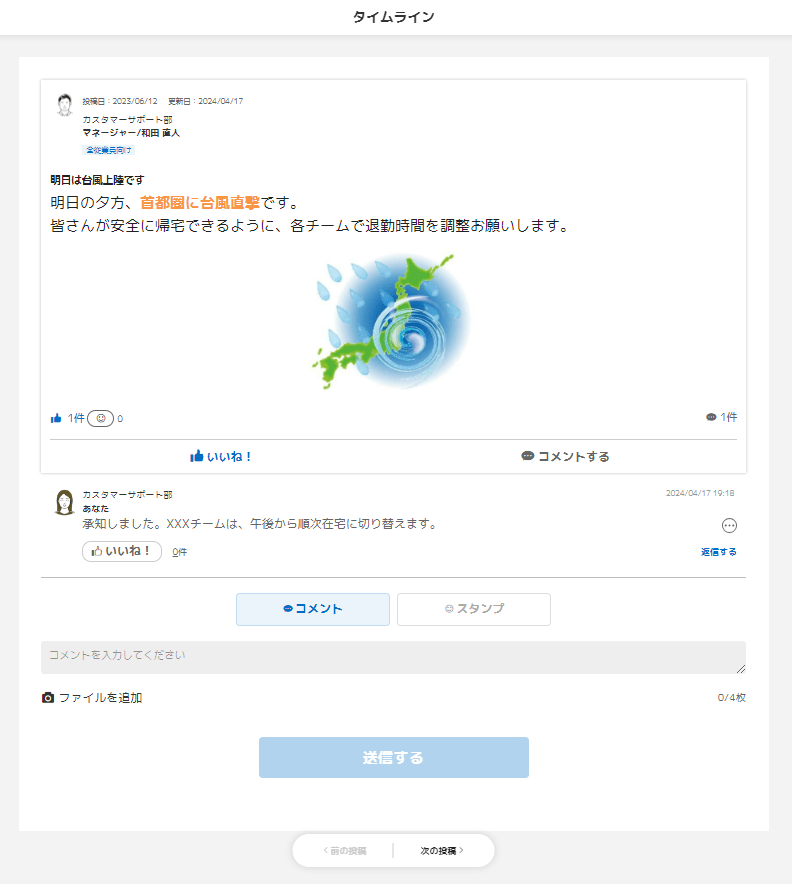 当社の場合、情報共有をした後に、その情報が更新されるケースが多く発生します。例えば、災害のような日々状況が変化する案件の場合、第一報、第二報、第三報と立て続けに情報が更新されていきます。