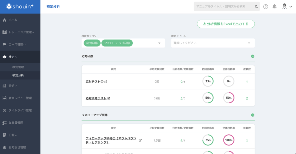 管理画面では検定の初回合格率やスタッフごとの受験状況が分析できる