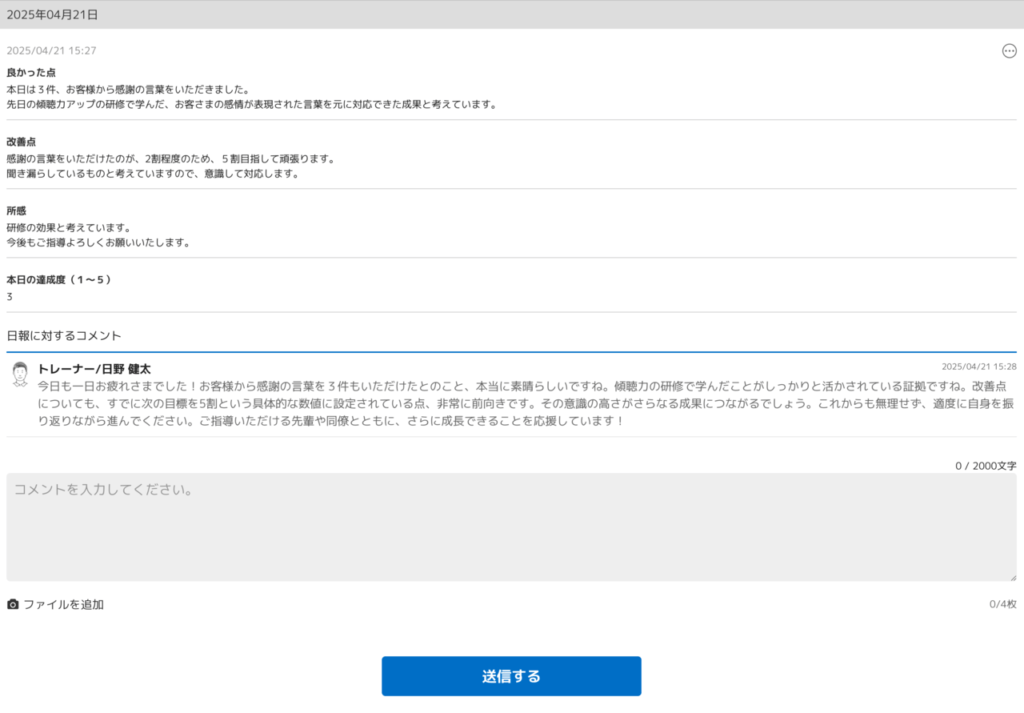 トレーニーの記入に対してトレーナーがコメントをつけることで研修状況の共有・コミュニケーションの促進が実現する