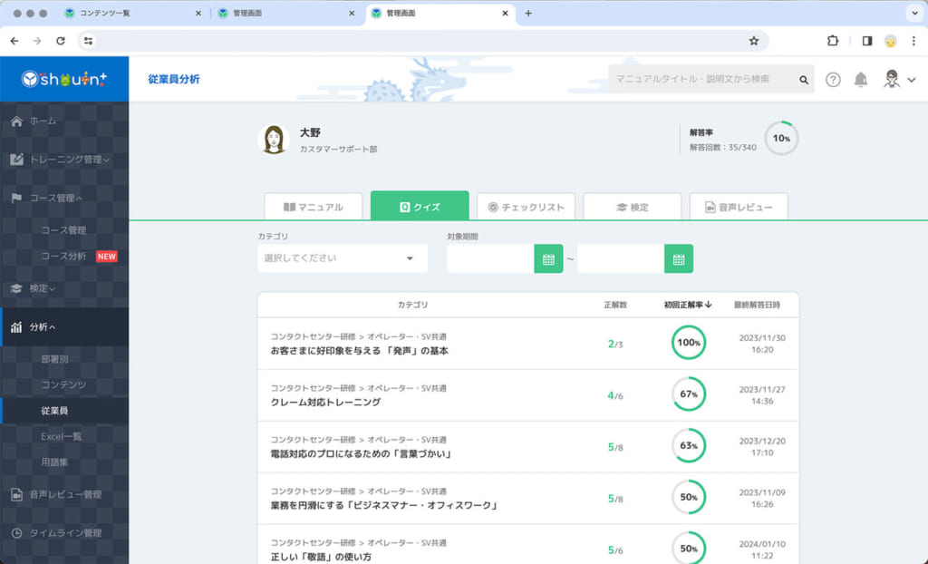 管理者向けの画面から、オペレーターごとの教育実施状況が確認できる