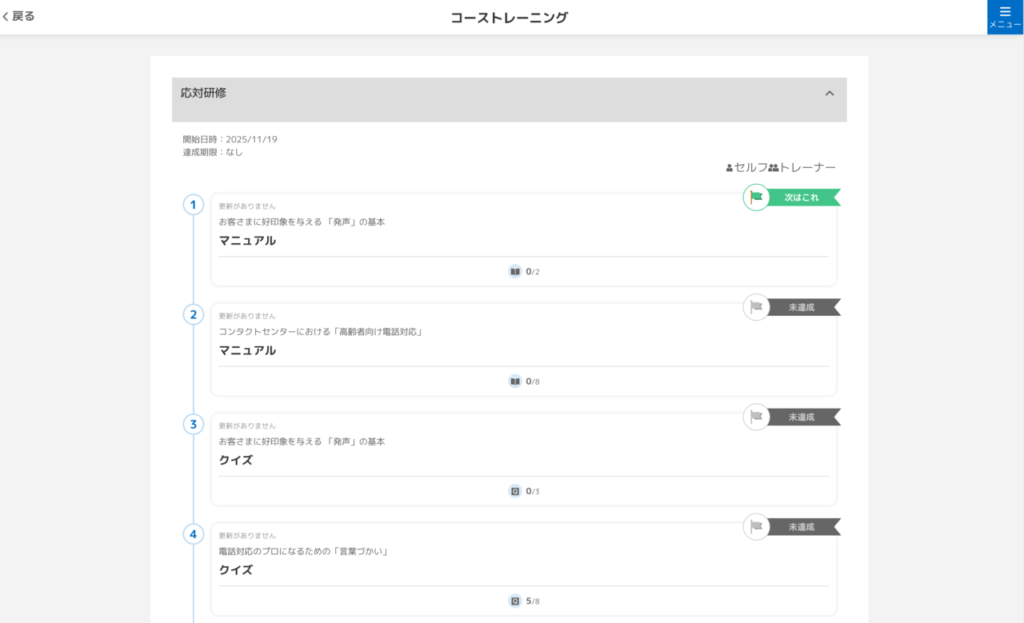 研修では「コーストレーニング」機能を活用し、基礎コースを1つ、応用コースを3つ用意してトレーニングを実施しています。各コースには、電話対応の幅広い知識やマナーを学べる「プリセット動画」から必要なコンテンツを選定し、難易度が段階的に上がるよう設計しています。最終的にはクレーム対応について学びます。