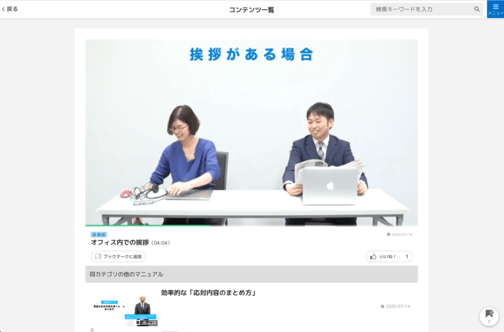 「オフィス内での挨拶」という動画が特に気に入っています。社内コミュニケーションは、得意な人と苦手な人でスキルの差が意外と大きいものです。そのため、お客さま対応だけでなく、こうしたコミュニケーションスキルを向上させるコンテンツは非常に有用性が高いと感じています。